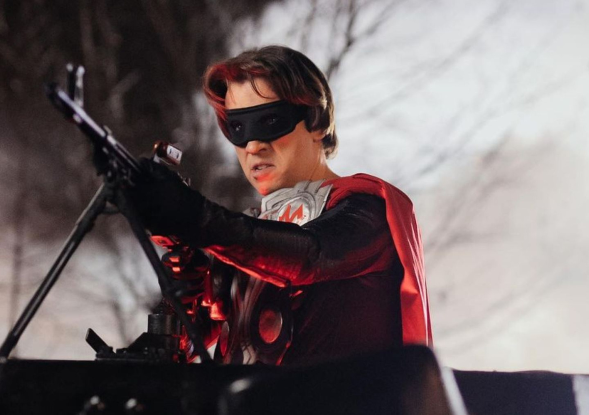 На фото Галкин запечатлён в чёрном костюме с алым плащом и красными буквами «М». Он позирует на внедорожнике с оружием в руках.