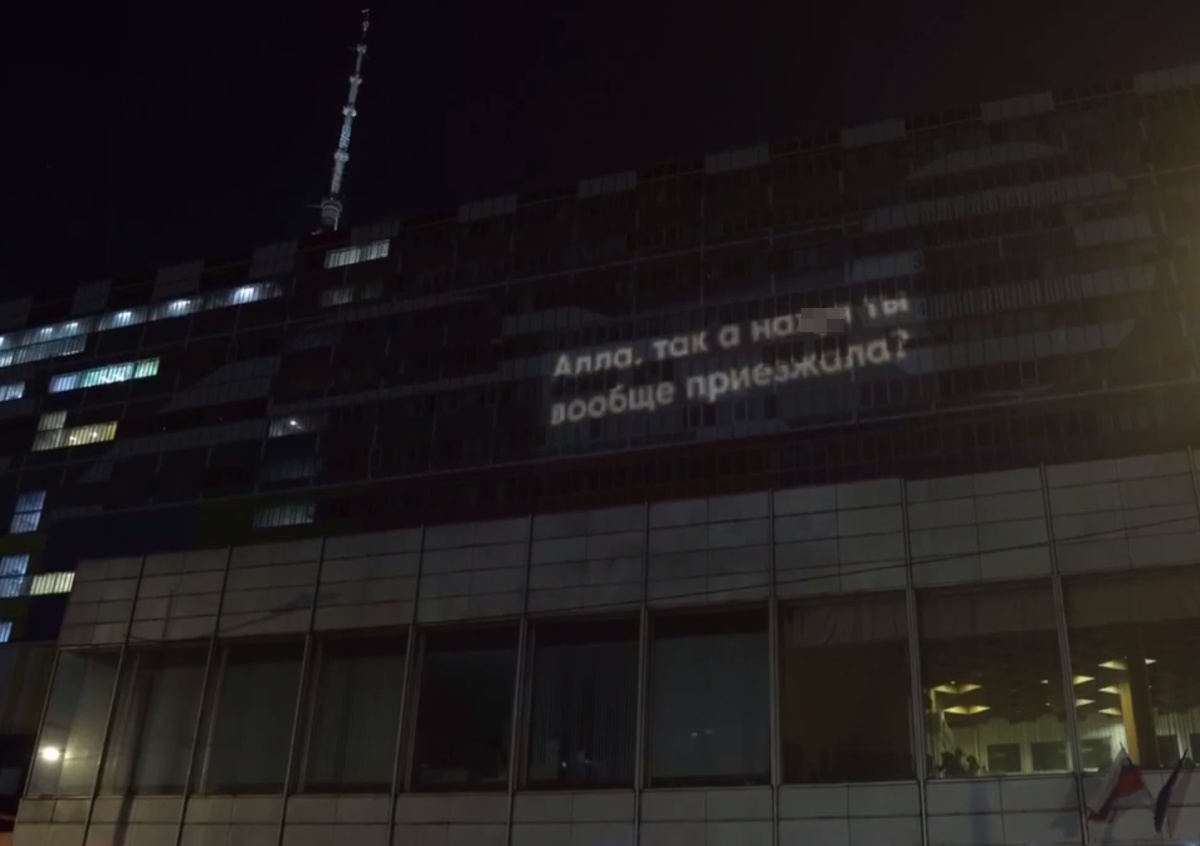 На фасаде «Останкино» появилось нецензурное обращение к певице Алле Пугачевой, пишет Telegram-канал StarHit. Авторы послания поинтересовались, с какой целью после отсутствия в течение нескольких месяцев в РФ Примадонна возвращалась на родину, а потом все равно уехала из страны.