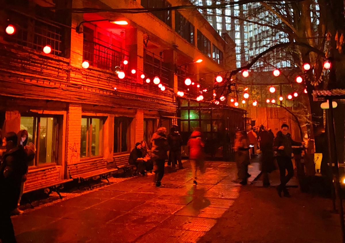 На территории около Arma можно было увидеть три костра и поленницу с дровами, которые подкидывали в огонь в течение ночи. Многие посетители, пожелавшие пообщаться друг с другом или покурить на улице, располагались на скамейках, креслах под навесом и в деревянном вагончике. Именно последняя локация особенно пользовалась спросом. Неподалеку от нее за ограждением находился пруд. Некоторые посетители даже рассказывали, что в чатах клуба его предлагали использовать в качестве купели, так как мероприятие проходило в канун Крещения.