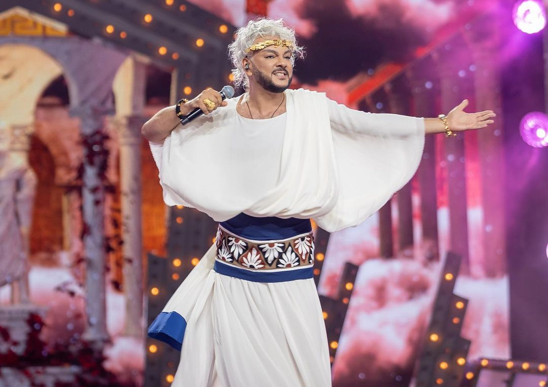 Удивился даже увидевший его на сцене Николай Басков. Киркоров выбрал греческий наряд: белый пеплос дополняет синий пояс с орнаментом, внутри которого изображены ромашки. На голове — стильный лавровый венок. В описании поста Киркоров отметил итальянский дом моды Dolce & Gabana. Мнения подписчиков насчёт образа разнятся.