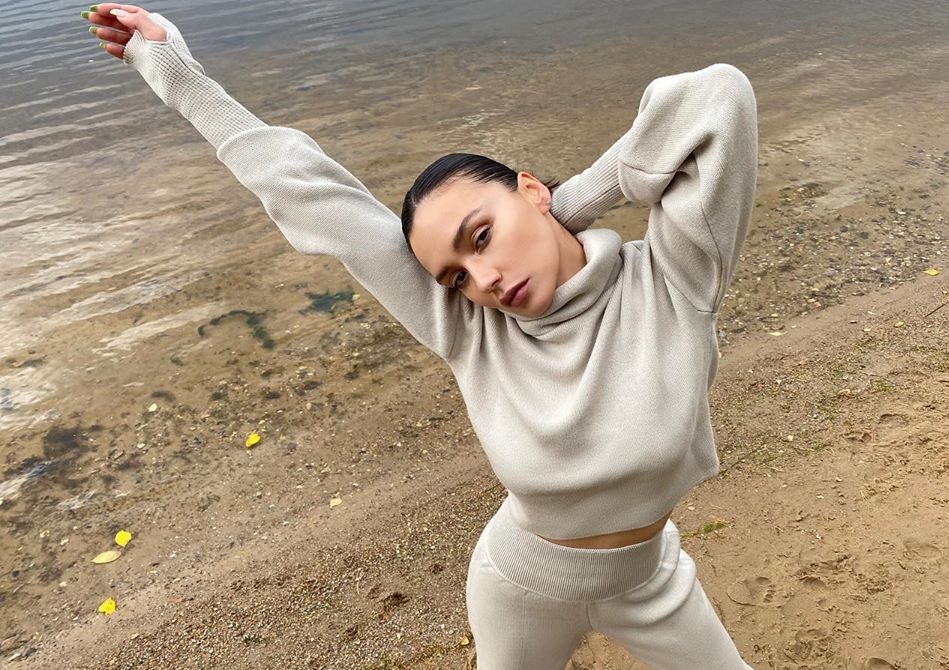 Для прогулки по осеннему пляжу экс-участница группы «Серебро» выбрала костюм из трикотажа песочного цвета. Монохромный аутфит 35-летняя звезда назвала «осенним комфортом».
