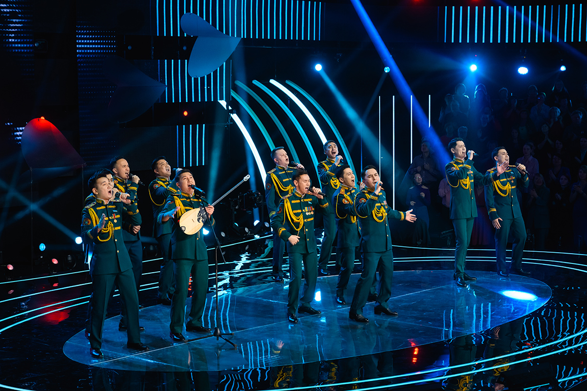 Участники программы «Ну-ка, все вместе! Хором!» — мужской хор Ансамбля песни и танца Национальной гвардии Республики Казахстан