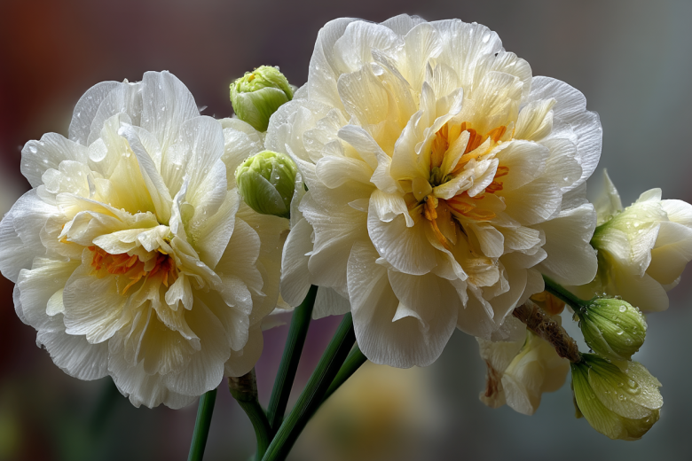 В начале цветения в центре преобладают яркие лимонно-желтые тона, а по краям — нежные сливочно-белые. По мере взросления цветок светлеет, превращаясь в белоснежное облако с легким лимонным оттенком в глубине. Цветение начинается в середине весны, обычно в апреле-мае, и продолжается до трех недель, наполняя сад тонким, сладковатым ароматом.