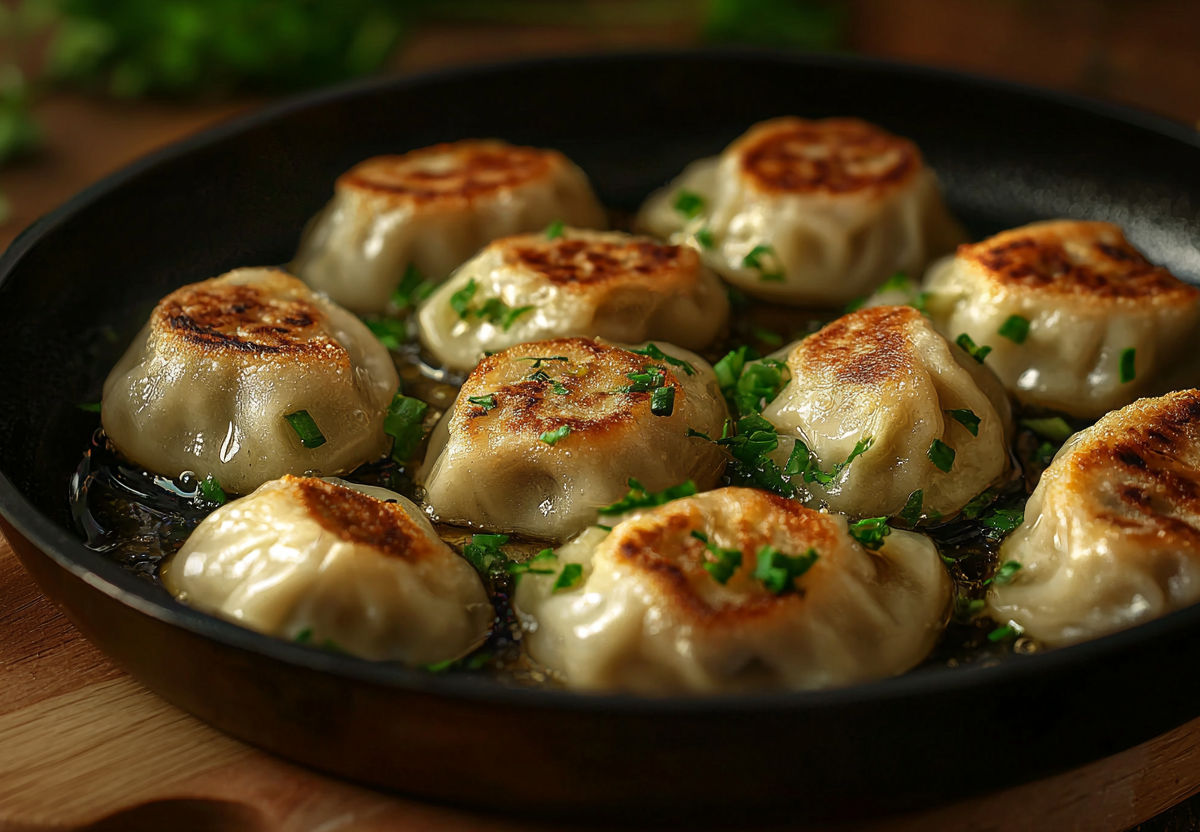 Жареные пельмени с соевым соусом и кунжутом