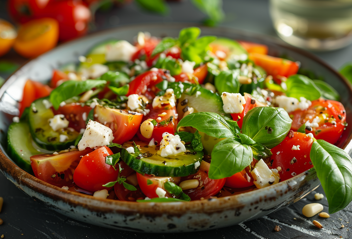 Вам понадобятся спелые томаты — 2 шт. (нарезка крупными дольками), молодые огурцы с пупырышками — 2 шт. (соломкой), фета в рассоле — 150 г (ручная крошка). По желанию можете добавить растительное или оливковое масло.