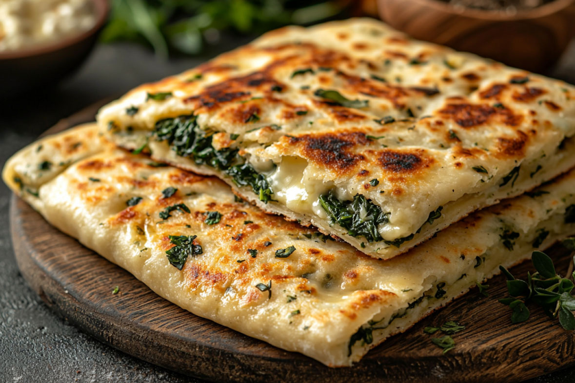 Для теста смешиваем 300 г муки, 150 мл теплой воды, столовую ложку оливкового масла и чайную ложку соли. Замешиваем крутое тесто, накрываем на 20 минут. Для начинки: 200 г раскрошенной брынзы, пучок мелко нарезанного шпината, два измельченных зубчика чеснока. Тесто раскатываем в тонкие круги, на одну половину выкладываем начинку, накрываем второй половиной, защипываем края. Обжариваем на сухой сковороде до характерных коричневых пятен.