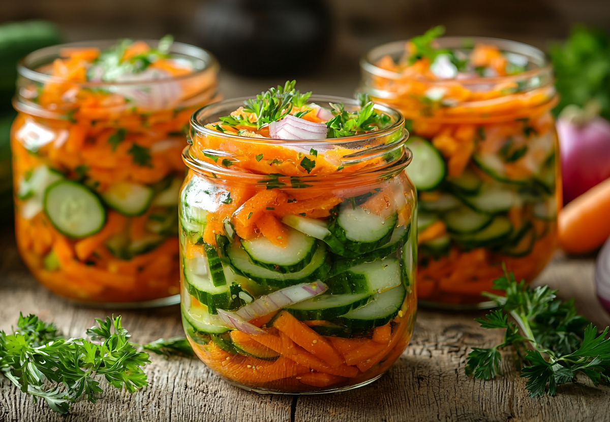 Возьмите 2 кг свежих огурцов, нарежьте их небольшими кубиками. Добавьте 3 натертые крупно морковки и 2 мелко порезанные луковицы. Для рассола вскипятите литр воды с 100 мл уксуса, 3 ст. л. сахара, 2 ст. л. соли и лавровым листом. Залейте овощи горячим маринадом, простерилизуйте банки 15 минут и закройте. Проверенная классика!