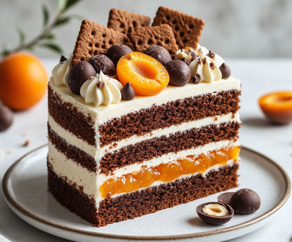 Этот торт словно съедобный луч летнего солнца, пойманный в нежную шоколадную оправу. Его характер определяет яркий солнечный вкус абрикосового конфитюра, который идеально оттеняет благородную горечь шоколадного бисквита. А хрустящие кусочки обжаренного фундука добавляют неожиданный акцент и приятную текстуру, создавая настоящее праздничное настроение в каждом слое.