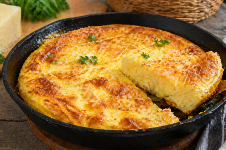 Форму или сковороду смазываете сливочным маслом, выливаете смесь и отправляете в разогретую до 180 градусов духовку примерно на 20-30 минут — до румяной корочки, при этом серединка должна слегка подрагивать.