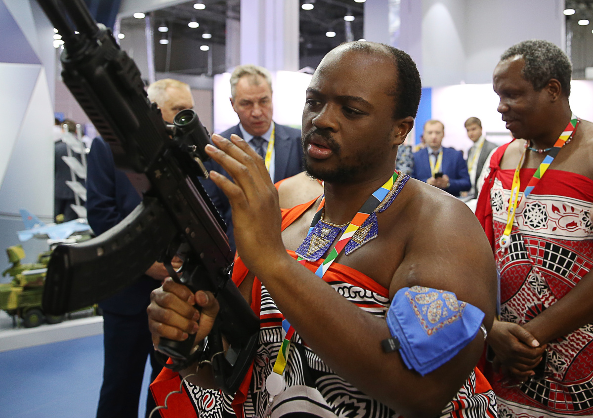 Король Свазиленда Мсвати III пришёл на форум Россия — Африка в национальном костюме. Мужчина заинтересовался оружием российской компании ORSIS.