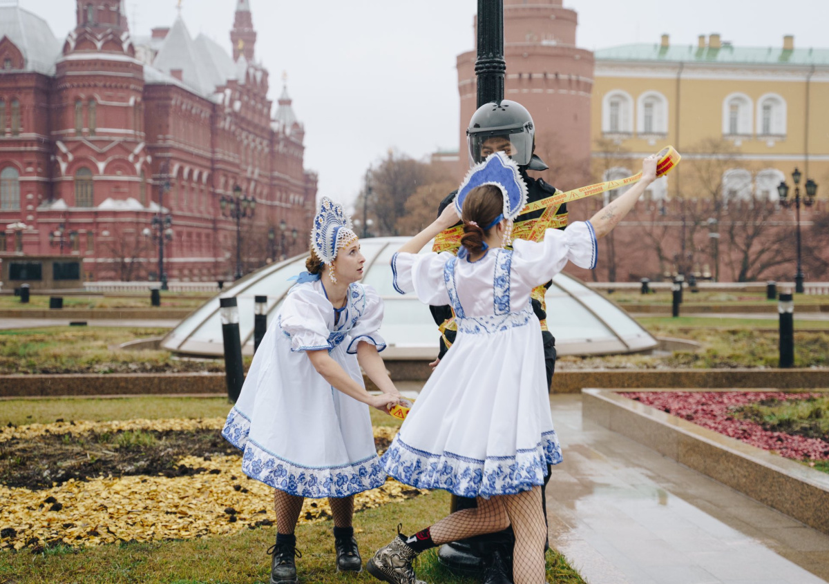 Некоторое время назад в соцсетях появились видео, на котором активистки, одетые в русские национальные костюмы, приматывают скотчем к столбу художника Фархада Исрафилли-Гельмана. На нём была форма сотрудника ОМОНа.