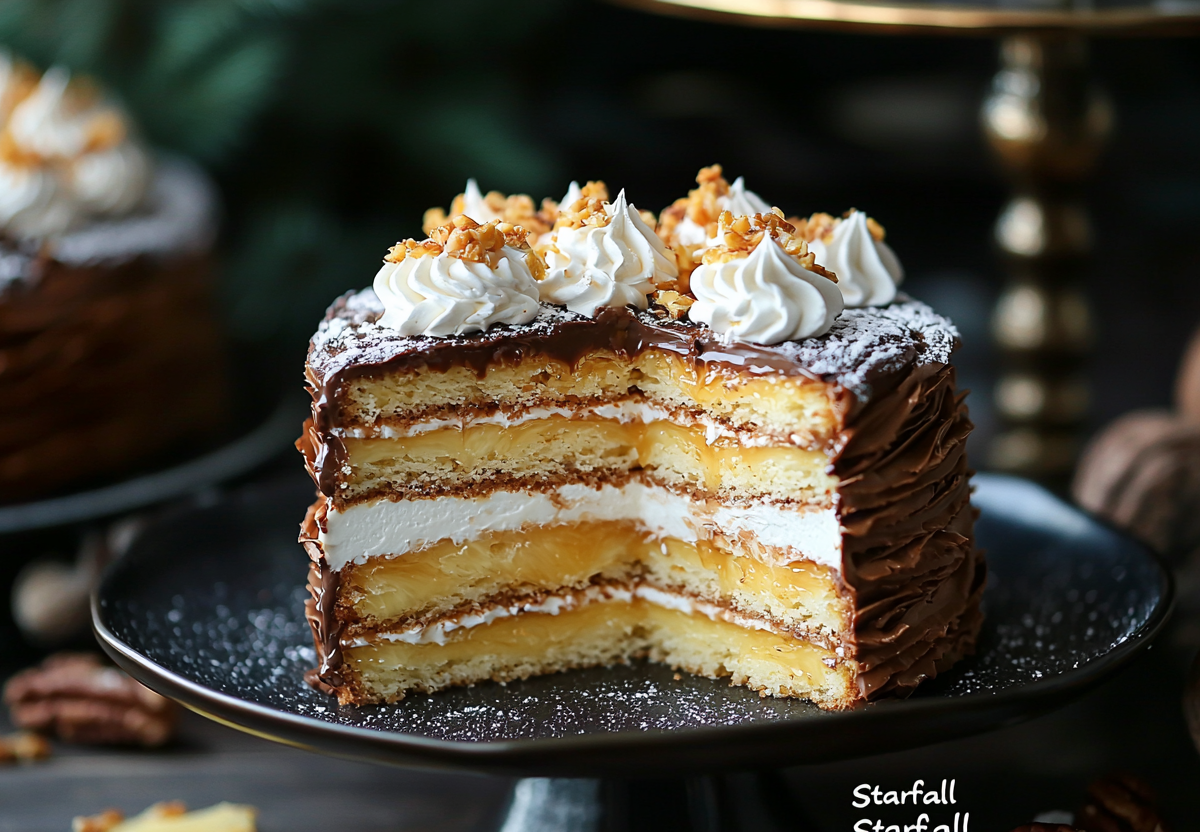 Для бисквита: 4 яйца, 150 г сахара, 130 г муки, 100 г сливочного масла, 200 г консервированных ананасов (пюрировать). Для безе: 3 белка, 180 г сахара. Для крема: 500 мл сливок 33%, 250 г маскарпоне, 100 г сахарной пудры. Для глазури: 150 г темного шоколада, 50 г сливочного масла, 2 ст. л. меда. Разогрейте духовку до 180 °C. Взбейте яйца с сахаром, добавьте ананасовое пюре, растопленное масло и муку. Выпекайте корж 25 минут. Для безе взбейте белки с сахаром в устойчивую массу, распределите на пергаменте и подсушите при 100 °C 1,5 часа. Взбейте сливки с сахарной пудрой, добавьте маскарпоне. Соберите торт: бисквит, крем, безе, снова крем. Растопите шоколад с маслом и медом, остудите до 35 °C и залейте торт. Украсьте перед подачей золотистой посыпкой и цедрой апельсина.