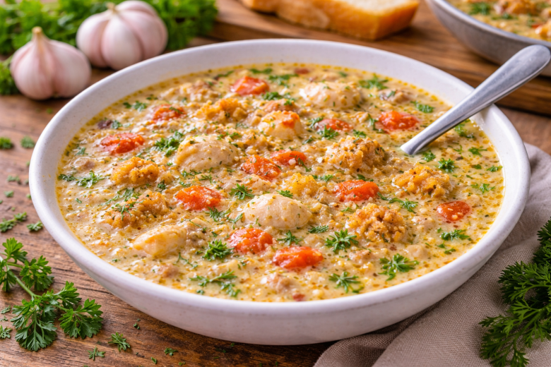 Ингредиенты: куриная грудка — 2 шт., помидоры — 3 шт., чеснок — 5-6 зубчиков, батон — 3-4 ломтика, оливковое масло — 3-4 ст. л., вода — около 1 л, яйца — 2 шт., паприка, чили — по вкусу, соль, перец — по вкусу, свежая зелень (петрушка, укроп) — большой пучок, немного тёртого сыра — по желанию.