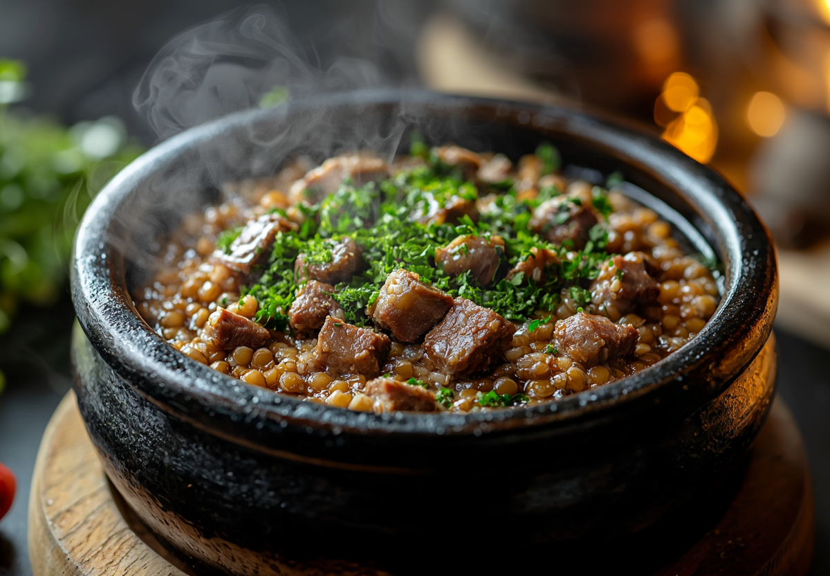 - Сборка: в горшочки слоями выложите гречку, поджарку с мясом, залейте горячей водой.
