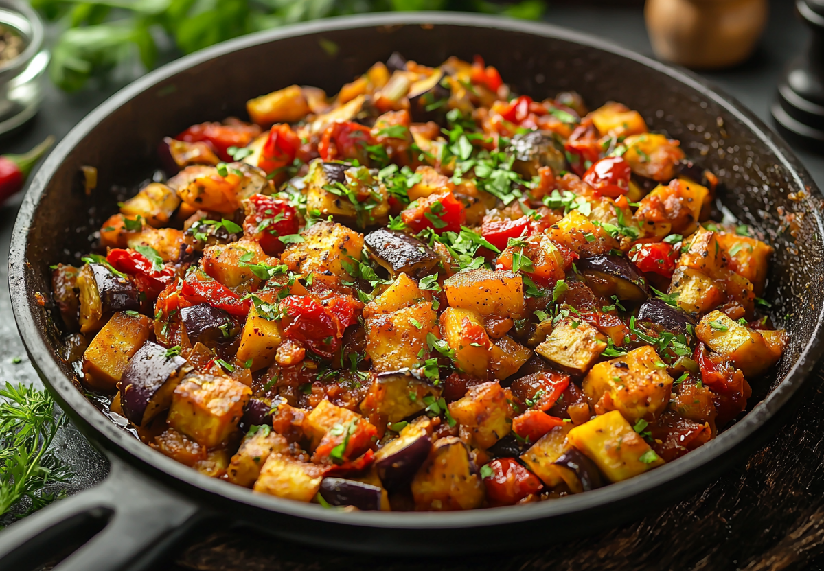 Этот ароматный рататуй по-восточному — настоящий фейерверк вкусов и специй! Он сочетает в себе нежность французского классического блюда с яркими восточными акцентами, создавая гармоничный и насыщенный вкус.