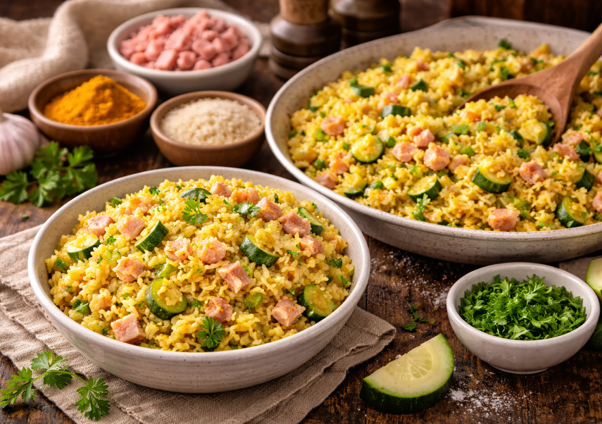 Ароматный рис с кабачками и ветчиной — простой и сытный ужин: все в одной сковороде без хлопот