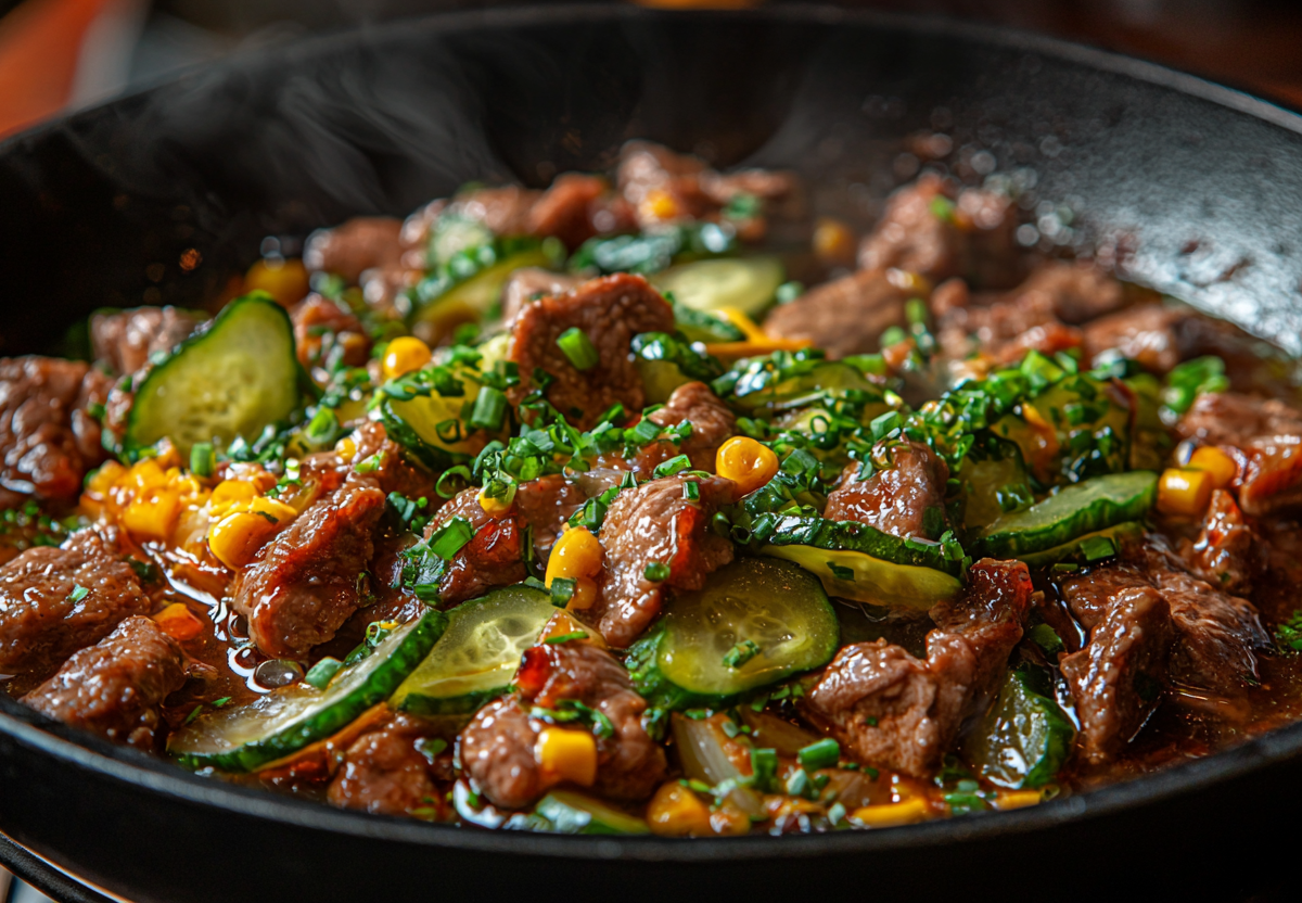Нарежьте 500 г говядины соломкой и обжарьте до румяной корочки. Добавьте 2 нарезанных луковицы, 2 моркови брусочками и пассеруйте до мягкости. Главный секрет — 3-4 соленых огурца, нарезанных ломтиками: они придадут блюду ту самую пикантную нотку.