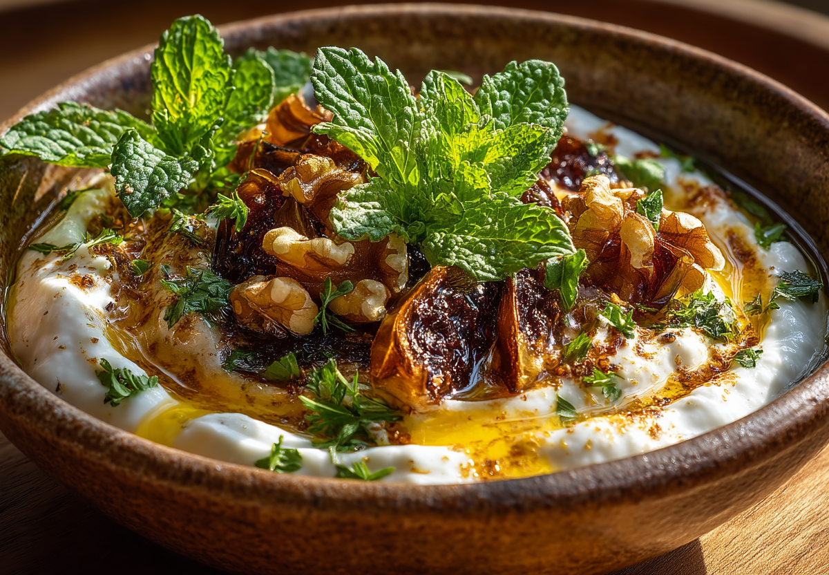 В этом блюде идеально все: теплая, почти горячая баклажанная основа встречается с холодной сметаной. Маслянистая тающая паста контрастирует с хрустом грецких орехов и карамельных луковых нитей. А тонкие золотые нити шафрана, растворенные в воде, добавляют не столько вкус, сколько цвет и легкую тайну — драгоценную пыльцу на поверхности.