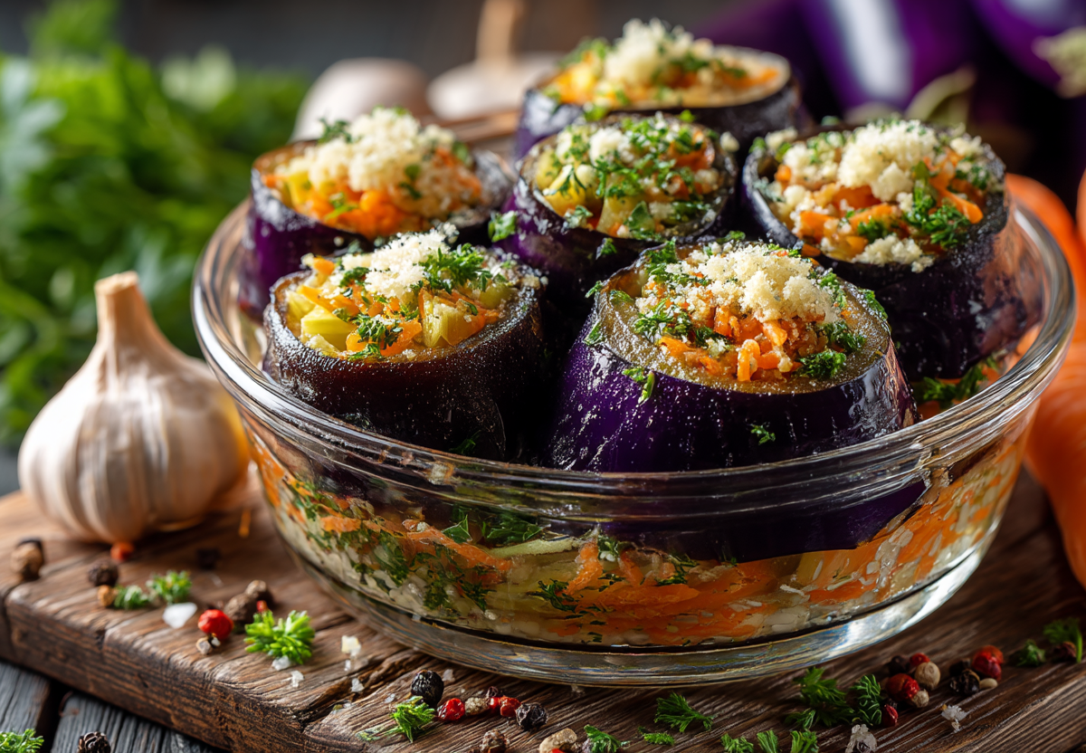 Нафаршируйте полученной массой надрезы в баклажанах. Сложите баклажаны в миску, закройте крышкой. Оставьте мариноваться в холодильнике на ночь.