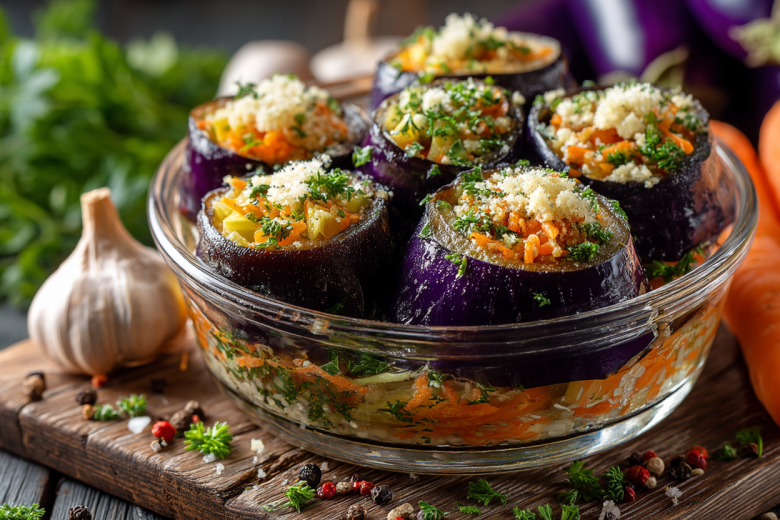Рецепт: у баклажанов сделайте надрезы крест-накрест, не дорезая до конца. Отварите в подсоленной воде 3-5 минут, откиньте на дуршлаг, остудите. Морковь натрите на терке для корейской моркови, петрушку мелко порубите, чеснок измельчите. Смешайте морковь, петрушку, чеснок, уксус, масло, сахар, соль, перец и кориандр.