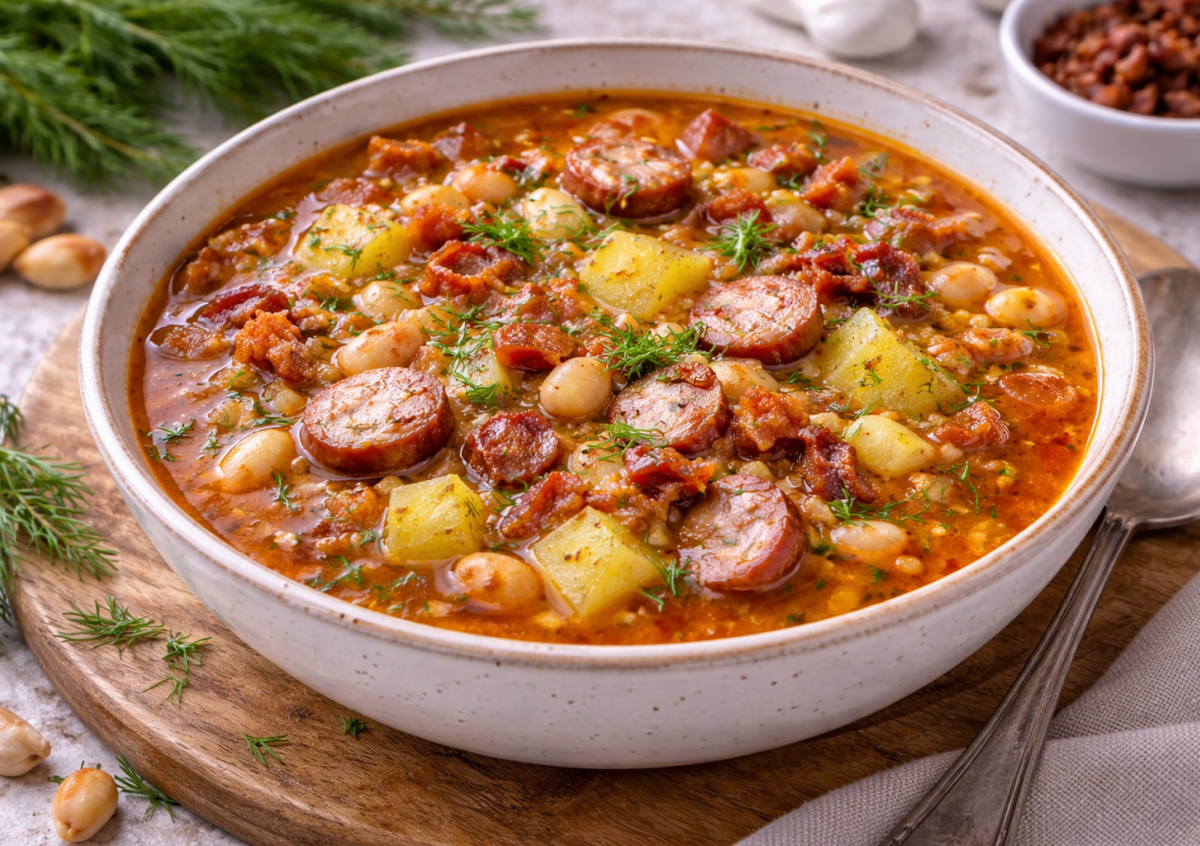 Ингредиенты: фасоль консервированная в банке — 1 банка (400 г), картофель — 3 шт., бекон — 200 г, охотничьи колбаски — 3-4 шт., лук репчатый — 2 шт., морковь — 1 шт., томатная паста — 1 ст. л., чеснок — 2 зубчика, растительное масло — для жарки, соль — по вкусу, черный молотый перец — щепотка, лавровый лист — 1 шт., свежий укроп — 1 пучок, вода или бульон — около 1,5 л.