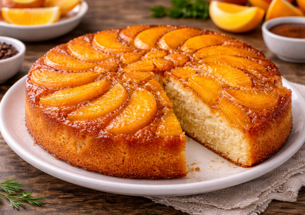 Банка персиков и простое тесто на молоке: пирог-перевертыш — просто классный