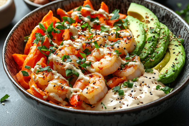 Для заправки смешиваю три ложки тахини с соевым соусом и водой до однородной консистенции. В глубокую тарелку выкладываю запеченный батат, потом слой перца, авокадо, креветки и две ложки зерненого творога для свежести. Поливаю все соусом и посыпаю поджаренным кунжутом. Получается настолько ярко и вкусно, что даже мыслей о другом обеде не возникает!