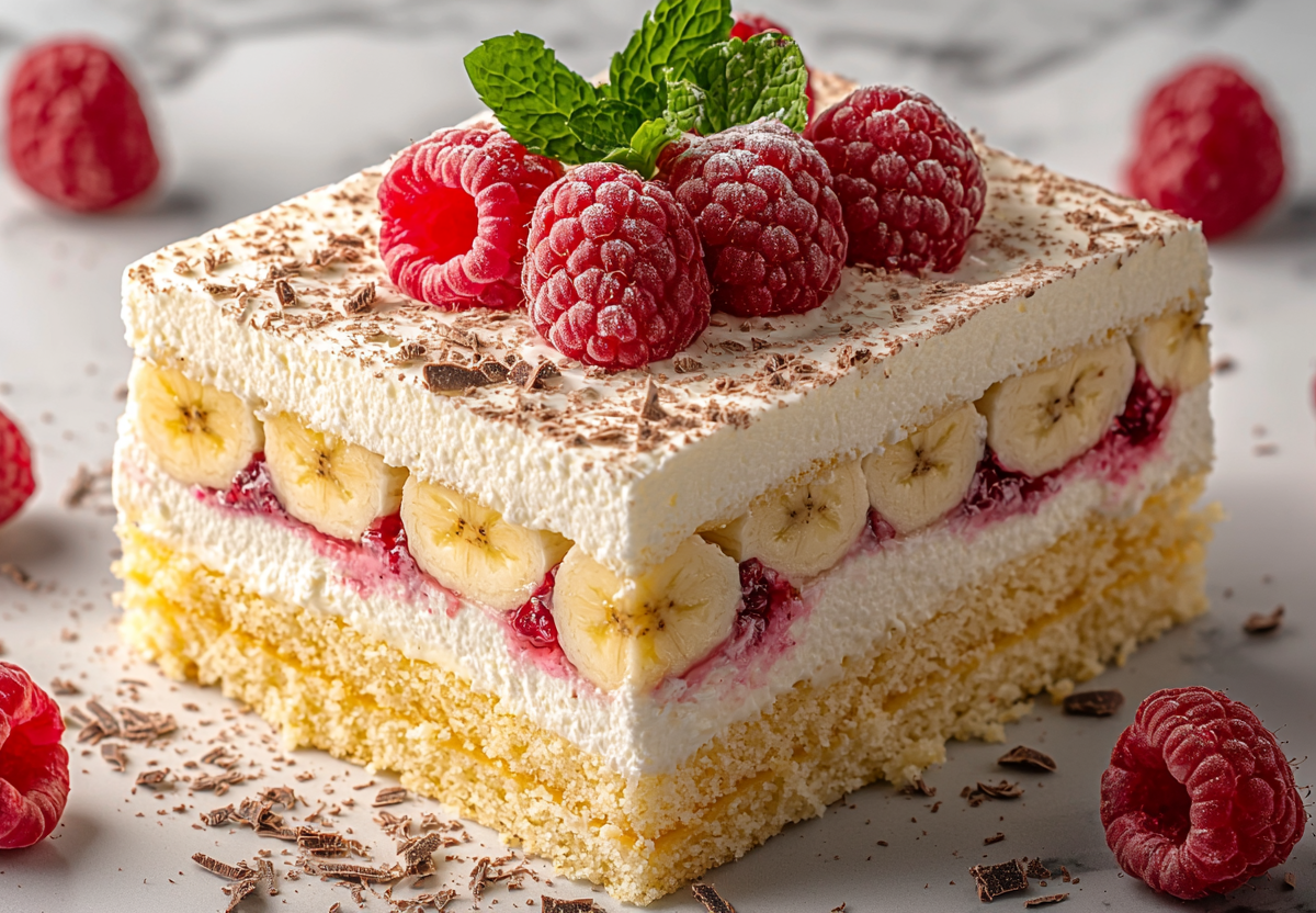- Крем: 300 г творога + мед взбейте в воздушную массу. Корж разрежьте на четыре части. Каждый слой промажьте кремом, добавьте кусочки банана и малину. Верх украсьте оставшимся кремом и тертым шоколадом.