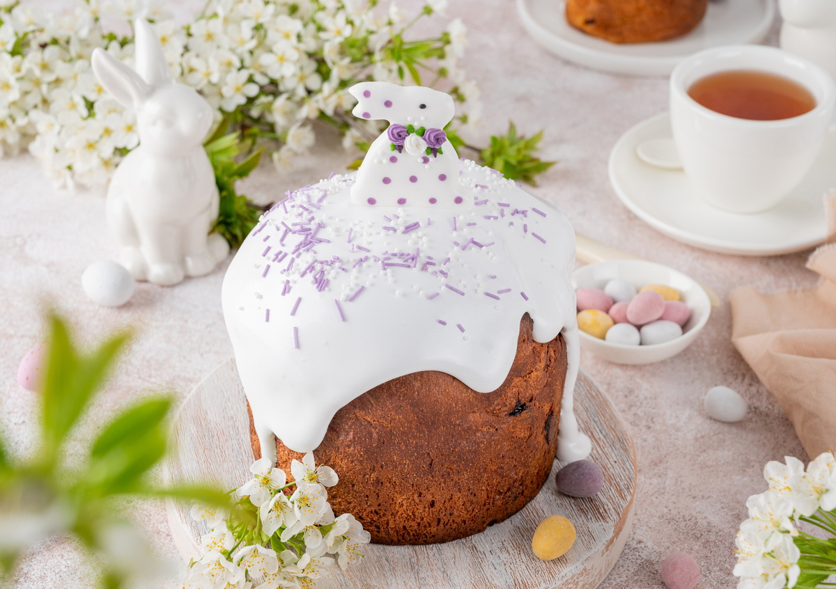 - Готовой смесью нужно полить кулич и присыпать сверху кондитерскими украшениями. Дайте глазури остыть.