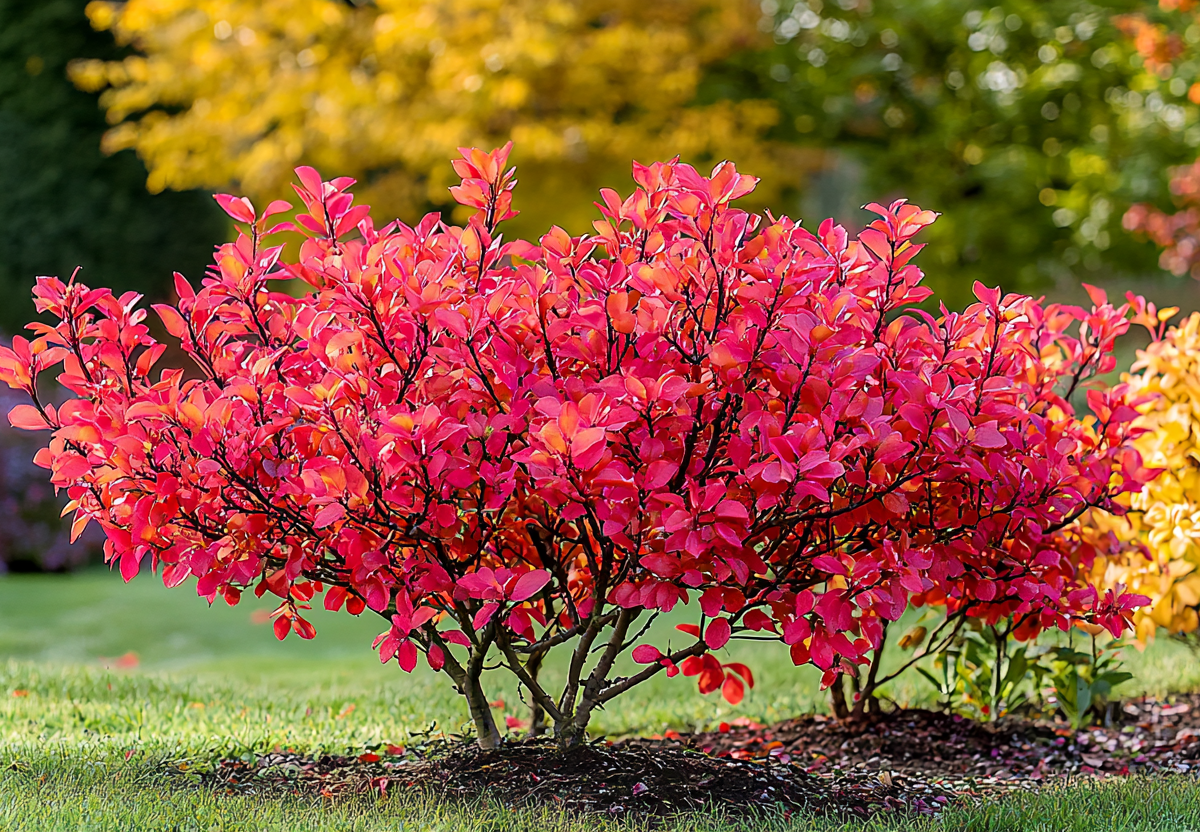 - Осенний шоу-стоппер — в сентябре-октябре куст превращается в огненный шар, затмевая другие растения.