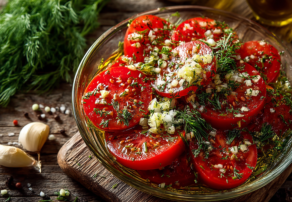 Сочные томаты, чеснок, зелень и пряный маринад с уксусом и острым перцем создают взрыв вкуса. Идеально к мясу, картошке или как самостоятельная закуска.