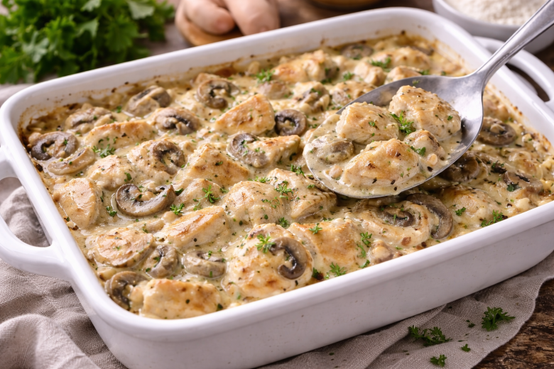 Фишка здесь в соусе: он пропитывает курицу, делает ее мягкой и совсем не сухой, а грибы и лук добавляют насыщенный вкус. В итоге получается простое, но очень уютное домашнее блюдо.