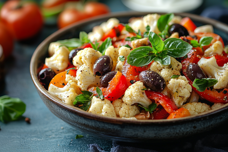 Этот салат я случайно придумал, когда нужно было срочно приготовить что-то легкое к ужину, а в холодильнике оказались только цветная капуста и овощи. Сочетание хрустящей капусты со сладким перцем и пикантными маслинами оказалось настолько удачным, что теперь это блюдо регулярно появляется на нашем столе.