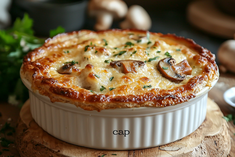 Для приготовления вам понадобится: 400 г куриного филе, 300 г шампиньонов, луковица, 200 мл сливок 20%, 150 г твердого сыра, упаковка готового слоеного теста, 2 ст. л. муки, 50 г сливочного масла, соль, перец, мускатный орех. Курицу и грибы нарежьте небольшими кусочками, лук мелко нашинкуйте. Обжарьте лук на масле до прозрачности, добавьте курицу, затем грибы. Готовьте 10 минут. Посыпьте мукой, перемешайте, влейте сливки. Тушите до загустения соуса. Добавьте половину тертого сыра, приправьте. Разложите начинку по кокотницам или порционным формам. Сырную часть оставьте для посыпки. Раскатайте тесто, вырежьте из него кружки чуть больше диаметра форм. Накройте формы тестом, защипните края, смажьте желтком. Посыпьте оставшимся сыром. Выпекайте 20–25 минут при 200 °C до румяной крышечки. Подавайте немедленно.