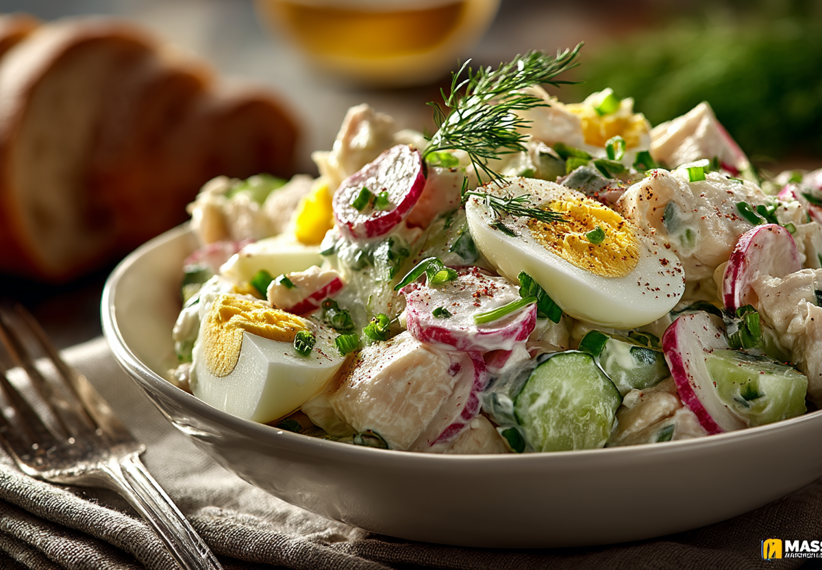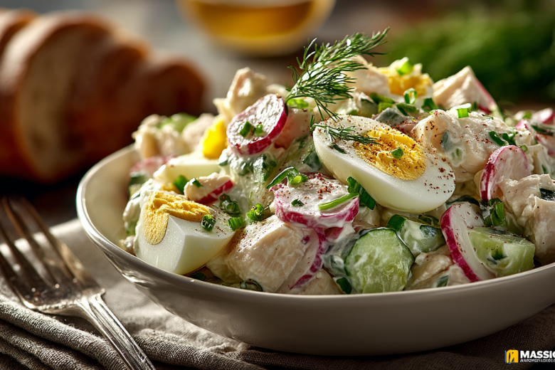 Беру отварную куриную грудку, свежий редис, огурец, яйца и зеленый лук — нарезаю кубиками, смешиваю, заправляю сметаной или майонезом. Через 3 минуты на столе салат, который получается сочным, хрустящим, витаминным и таким ароматным, что его хочется есть ложкой.
