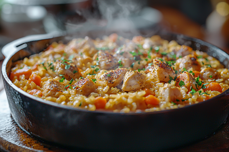 Для приготовления вам понадобится: 400–500 г куриного филе (грудки или бедра), 1 стакан риса, 1 крупная луковица, 1 морковь, 2–3 зубчика чеснока, 2 стакана горячей воды, соль, перец, специи для курицы, растительное масло. Куриное филе нарежьте небольшими кубиками. Лук и морковь мелко нарежьте. Разогрейте сковороду. Обжарьте курицу до легкой румяности, посолите и поперчите, выложите на тарелку. В ту же сковороду добавьте лук и морковь, обжарьте до мягкости. Верните курицу в сковороду, добавьте пропущенный через пресс чеснок и специи, перемешайте. Всыпьте промытый рис, разровняйте. Залейте горячей водой так, чтобы жидкость покрывала смесь на 1,5–2 см. Доведите до кипения, убавьте огонь до минимума и тушите 15–20 минут, пока рис не впитает всю жидкость и не станет мягким.