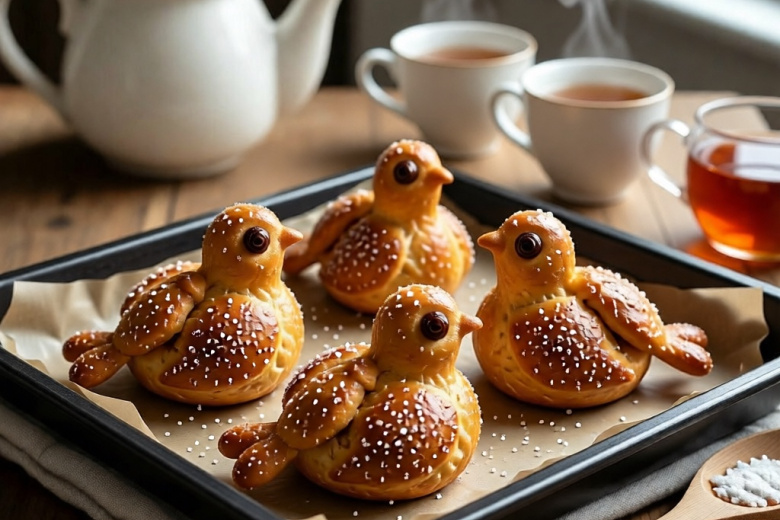 Для теста возьмите: 500 г муки, 200 мл теплой воды, 30 г свежих дрожжей (или 10 г сухих), 3 ст. л. сахара, 1 ч. л. соли, 50 мл растительного масла. Для украшения потребуется изюм и крепкий сладкий чай для смазки. Сначала в воде разведите дрожжи и сахар, добавьте половину муки, перемешайте и оставьте опару на полчаса в тепле. Затем введите соль, масло, остальную муку и тщательно вымесите тесто. Дайте ему подойти в течение часа. Раскатайте тесто в жгуты, сформируйте из них узелки, придавая форму птичек, вставьте глазки-изюм. Оставьте на противне на 20 минут, смажьте чаем и выпекайте при 190°С около 20–25 минут до золотистого цвета.