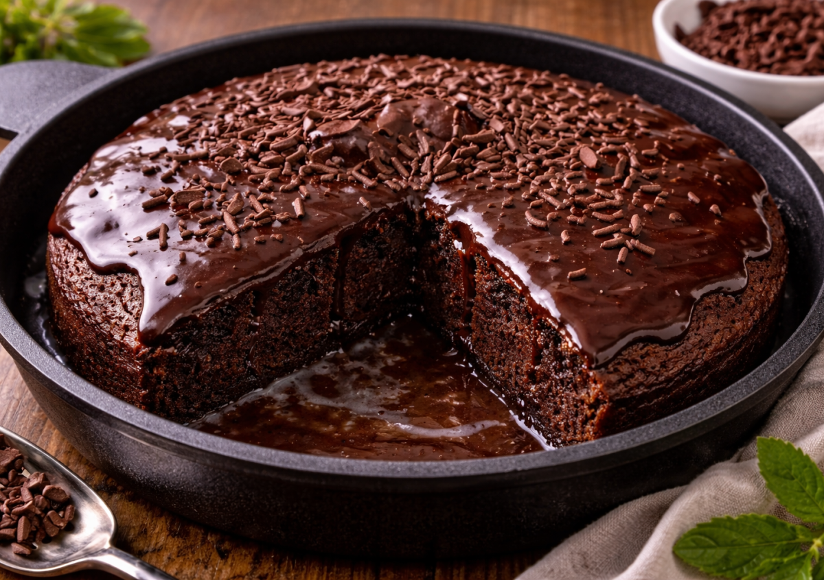 Этот пирог — моя настоящая палочка-выручалочка. Когда хочется чего-нибудь сладкого «прямо сейчас», а включать духовку нет ни времени, ни желания, я просто достаю сковороду. Всего по 50 граммов масла и какао — и через 20 минут на столе нежный шоколадный десерт, который выглядит так, будто с ним долго возились. Пирог получается очень мягким, влажным и буквально тает во рту.
