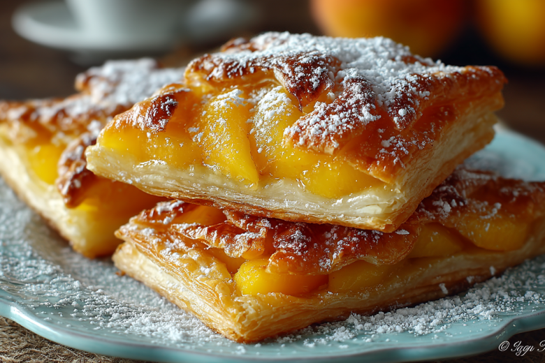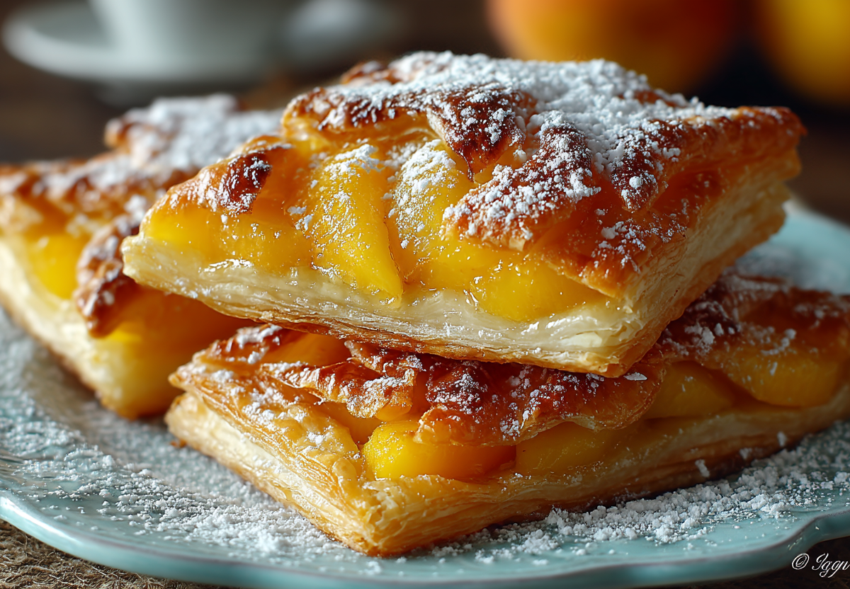 Получается обалденная вкуснятина: золотистое, слоистое тесто с хрустящей корочкой, а внутри — нежные, карамелизированные персики с легкой кислинкой, которые делают каждую слойку сочной и ароматной.