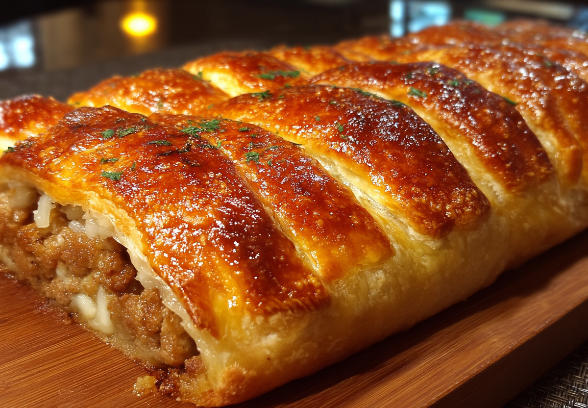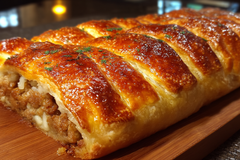 Это гениально простое и невероятно вкусное блюдо, идеальное для ужина или обеда. Получается обалденная вкуснятина: хрустящее, слоистое тесто с золотистой корочкой, а внутри — сочная мясная начинка с луком и специями, которая делает каждый кусочек ароматным и тающим во рту.