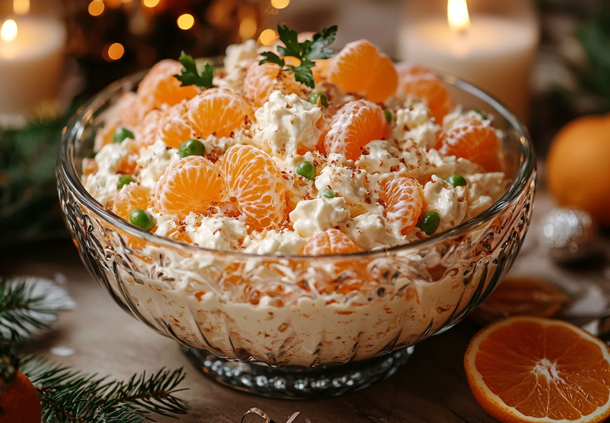 Вкус этого салата — это удивительная и смелая гармония: сливочный, солоноватый сыр, яркая сладковато-кислая свежесть мандарина и пикантная острота чеснока создают незабываемый вкусовой букет.