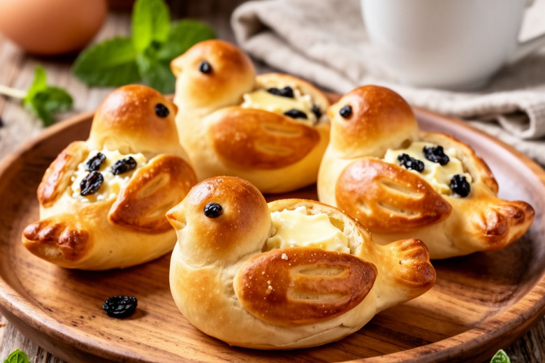 Для начинки смешайте творог с яйцом, сахаром и ванилином. Тесто разделите на шарики, раскатайте кружки, выложите начинку, сформируйте птичек: сделайте защип для хвостика, надрезы на спинке, вставьте глазки из изюма. Выпекайте при 180 °С 20–25 минут. Подавайте тёплыми — такие птички с творогом украсят пасхальный стол и согреют душу.
