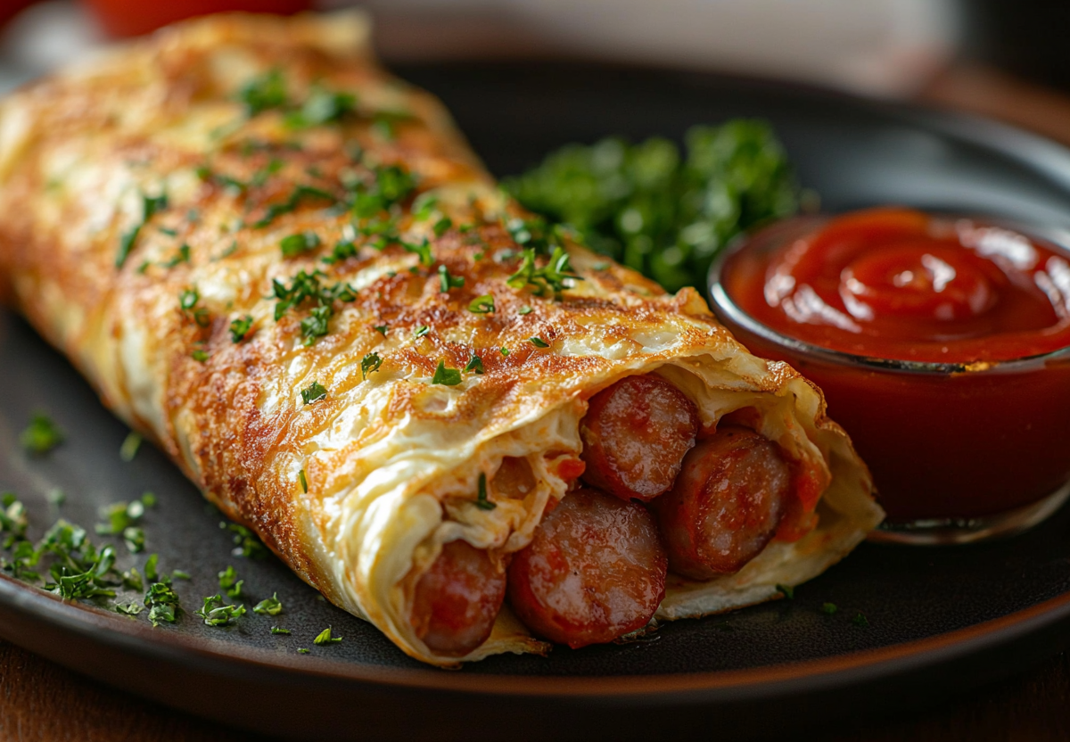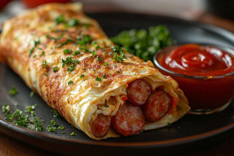 Для приготовления вам понадобится минимум продуктов: 2 сосиски, 2 яйца, 1-2 ч. л. кетчупа, соль, щепотка черного перца. Сосиски нарежьте тонкими колечками и обжарьте до румяности, затем снимите их. В миске взбейте яйца с солью и перцем. В ту же разогретую сковороду добавьте немного масла и влейте яичную смесь. На среднем огне жарьте омлет, пока его середина не схватится, а низ не станет плотным. Аккуратно лопаткой сделайте в омлете надрез от края до центра. Смажьте поверхность кетчупом. На одну четверть омлета (левую нижнюю, если представить его как круг) выложите обжаренные сосиски. Сворачивайте сэндвич по часовой стрелке: сначала накройте начинку пустой четвертью сверху, затем правой частью и завершите оставшимся четвертым сегментом, чтобы получился треугольник. Дожарьте с каждой стороны по 30–40 секунд для фиксации формы.