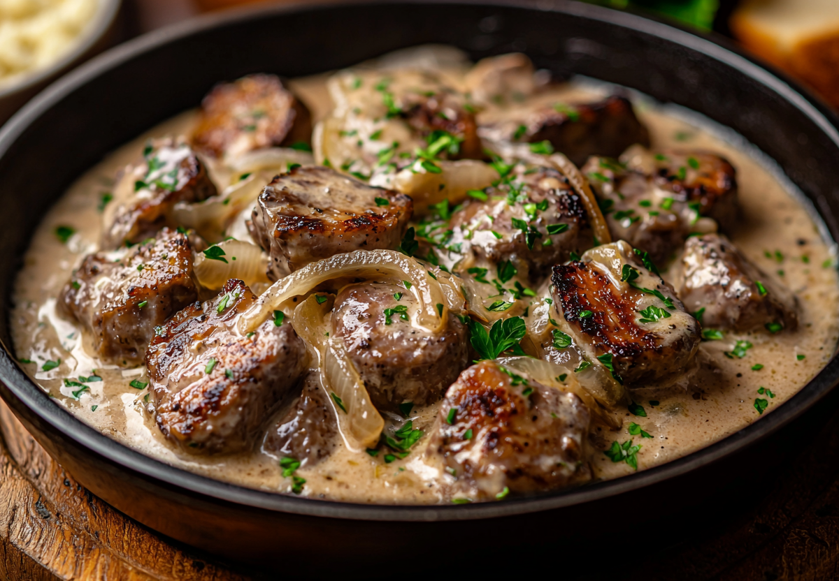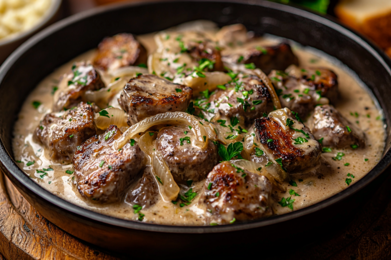 Секрет в том, что печень необходимо быстро обжарить в муке до румяной корочки, которая запечатывает соки внутри, а затем протушить в сметане с луком до мягкости.