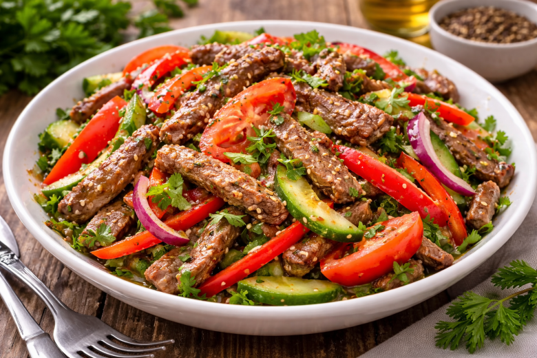 Этот салат сразу цепляет ароматом — теплая говядина, свежие овощи и насыщенная заправка дают тот самый «корейский» характер, где есть и острота, и сладость, и легкая кислинка. Получается не просто салат, а полноценное блюдо, которое спокойно заменяет ужин.