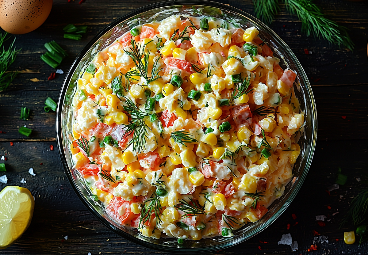 - Зелень шинкуем. В миске смешиваем кукурузу, крабовые палочки, помидоры, яйца, чеснок и зелень. Отдельно готовим заправку: смешиваем йогурт с соевым соусом, солью и перцем по вкусу. Заправляем салат, аккуратно перемешиваем и даем настояться 10–15 минут в холодильнике перед подачей.