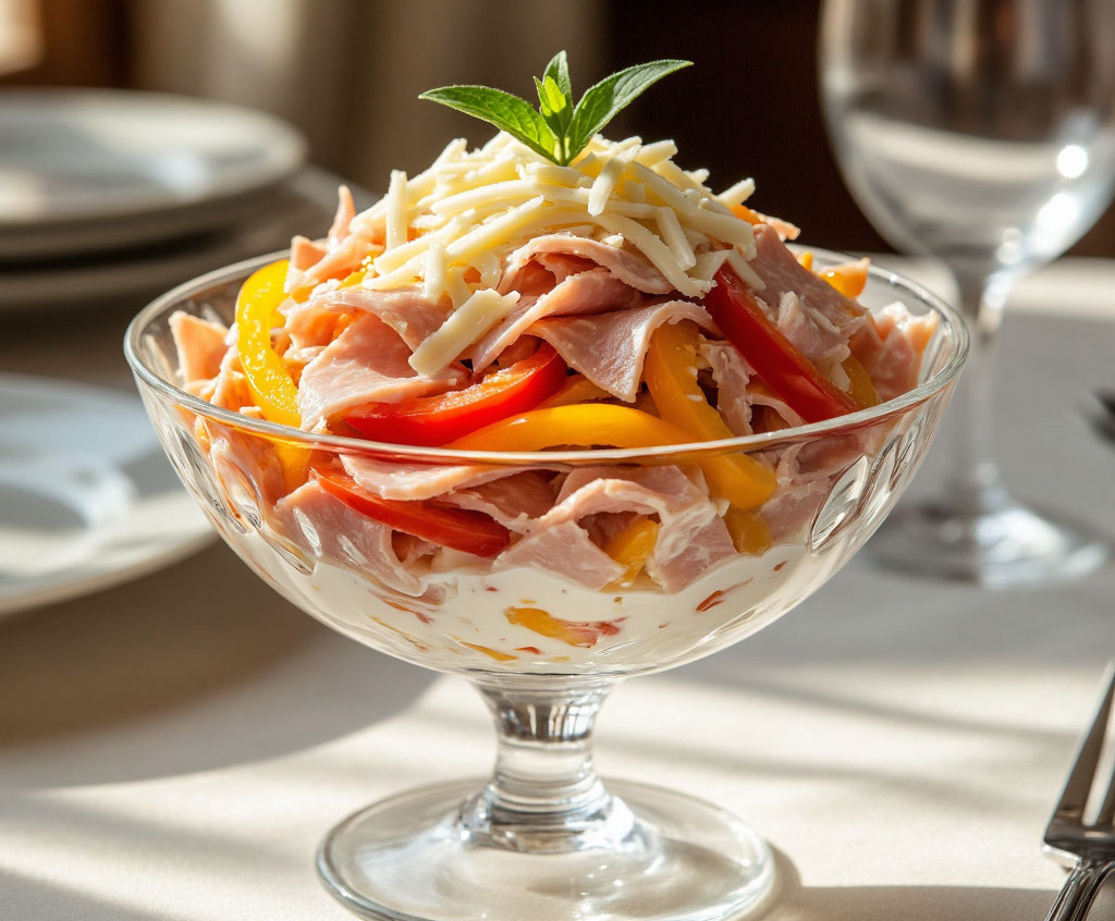 Беру ветчину, сыр и болгарский перец — и готовлю сытный салат за 15 минут, который выручает в любой день. Это гениально простое и невероятно вкусное блюдо, идеальное для быстрого ужина или неожиданных гостей. Его необычность в том, что из минимального набора продуктов получается сбалансированная закуска, где сочная ветчина, нежный сыр и хрустящий перец создают идеальную гармонию вкусов и текстур. Получается обалденная вкуснятина: упругие брусочки ветчины, мягкий сыр и сладковатый перец в лёгкой майонезной заправке с нотками свежей петрушки. Салат настолько универсален, что его можно подавать просто так, в тарталетках или завернуть в лаваш — всегда будет уместно и вкусно.