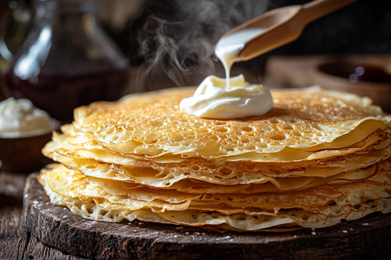 Этот удачный рецепт блинов с ажурными краями без точных подсчетов спасет каждого, у кого нет весов — все ингредиенты измеряем стаканами! Блины получаются тонкими, легкими, с красивыми кружевными дырочками, румяными краями и нежной, слегка маслянистой текстурой.