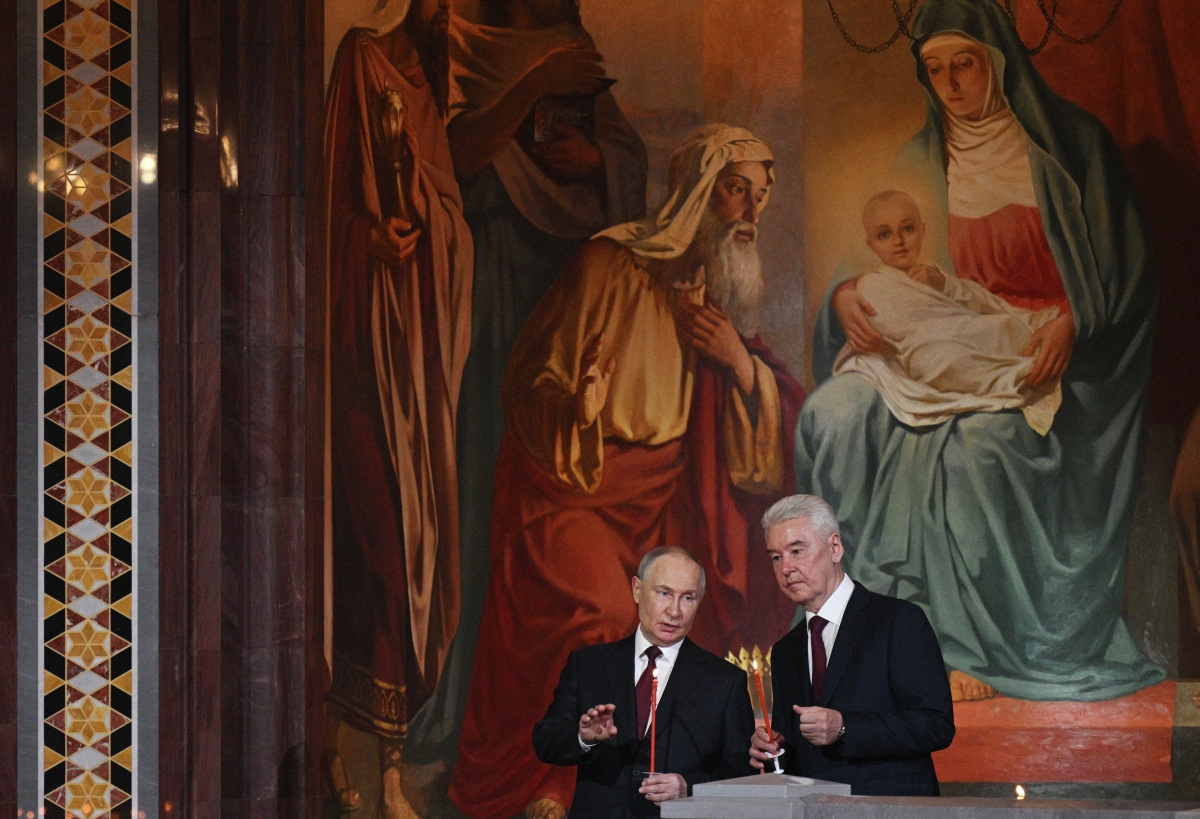 20 апреля 2025. Президент РФ Владимир Путин и мэр Москвы Сергей Собянин (справа) на праздничном пасхальном богослужении в храме Христа Спасителя в Москве