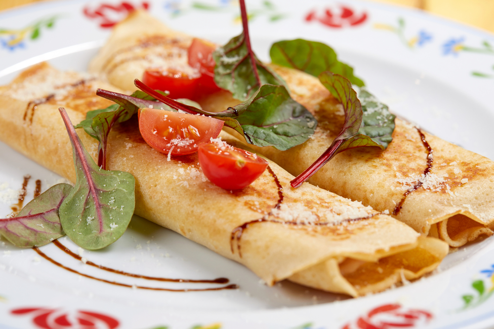 На готовый блин выложите натертый сыр и сразу сверните блин конвертиком или рулетиком. Верните его на сковороду и обжарьте до тех пор, пока сыр внутри не расплавится.